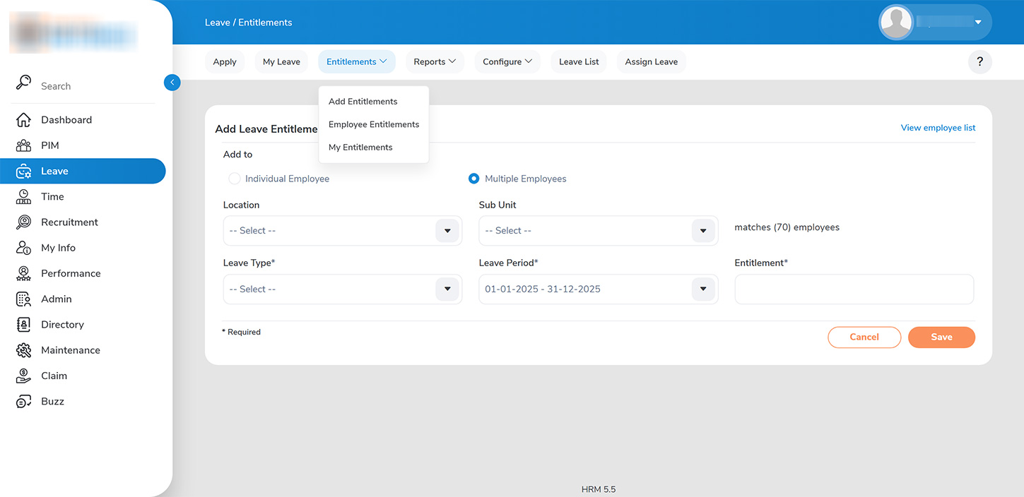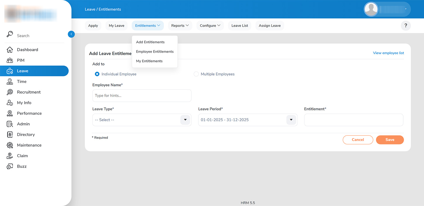 3. For individual employee entitlements, select the employee, choose the type of leave, and the applicable leave period, then enter the specific number of entitlement days for that employee.