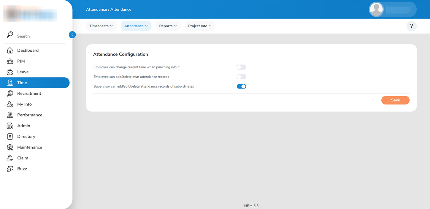 Administrator can manage the following requirements about attendance from TIME>ATTENDACE>CONFIGURATION