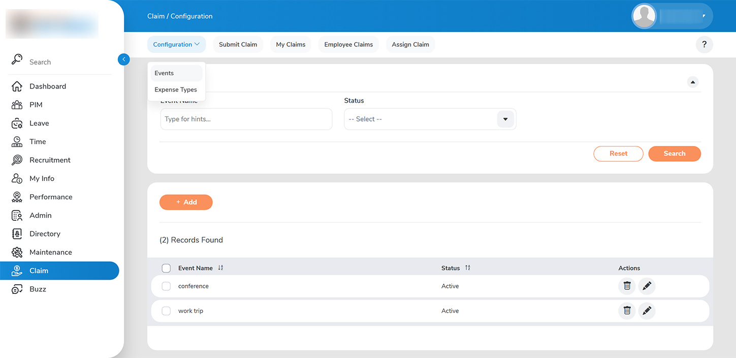 As an administrator, you are also empowered to configure all relevant event types for which employees can submit expense claim requests. Access this feature by selecting >>CLIAM > CONFIGURE > EVENT TYPE>>.