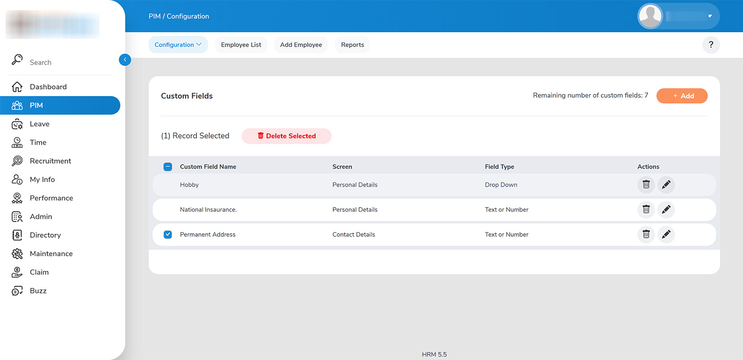 Administrators can remove custom fields by navigating to `PIM > CONFIGURATION > CUSTOM FIELDS`. Here, you will find a comprehensive list of all custom fields that have been added, along with the count of available fields remaining. To delete fields: – Click the delete button adjacent to each field entry, or select multiple fields for bulk deletion. – Please note that deletion is permissible only for fields that do not contain any data entries.
