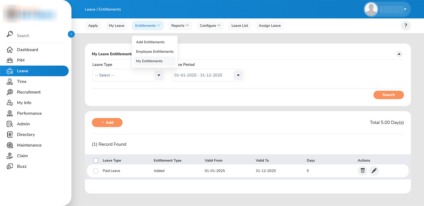 Employees can also verify their leave balance by going to >>LEAVE > ENTITLEMENTS > MY ENTITLEMENTS>>. This section displays a comprehensive list of all applicable leave types for the selected leave period, along with the total days available.